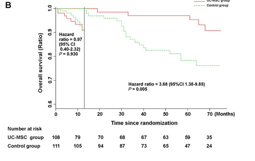 生存率改善:通過Landmark分析,在13個月至75個月的隨訪期間,臍帶干細(xì)胞治療組的總生存率明顯高于對照組。